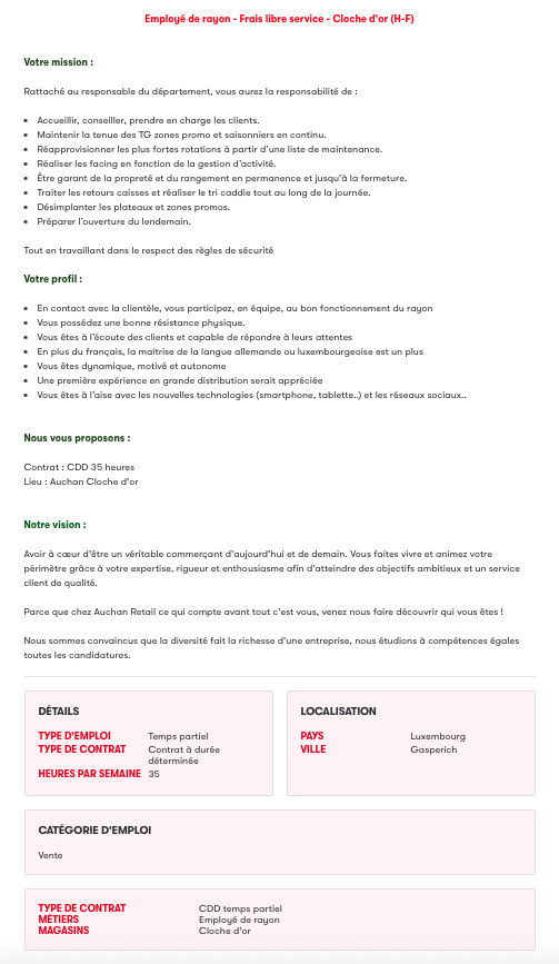 Employé de rayon - Frais libre service - Cloche d’or (M/F) Voir toutes les offres Auchan recrute ! Lien pour postuler : cliquez ici