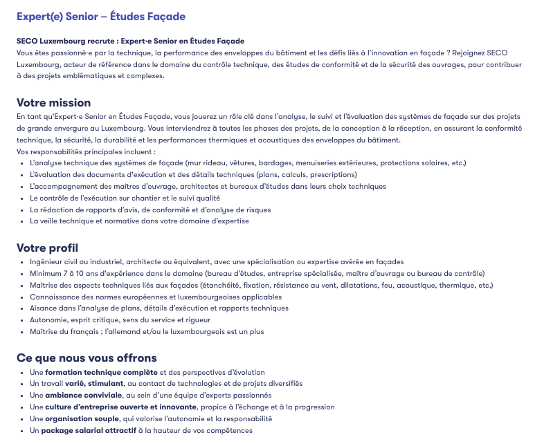 Expert Senior – Études Façade (m/f) / Seco Voir toutes les offres Seco recrute ! Lien pour postuler : cliquez ici