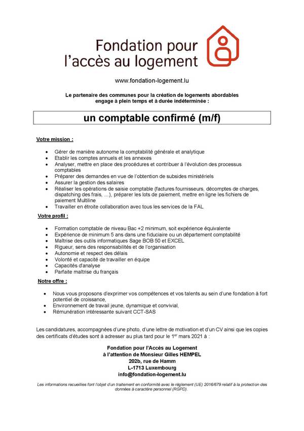 Fondation pour l’Accès au Logement recrute ! Voir toutes les offres Comptable confirmé (m/f) Pour plus d’informations : www.fondation-logement.lu