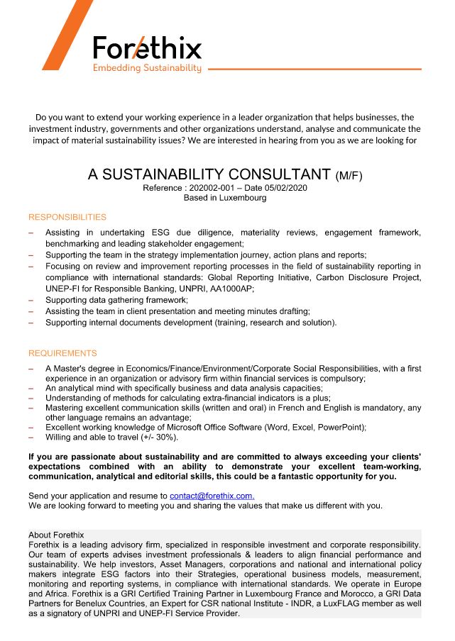 Forethix recrute ! Voir toutes les offres A sustainability consultant (m/f) www.forethix.com Téléphone (+352) 285 585-1 contact@forethix.com