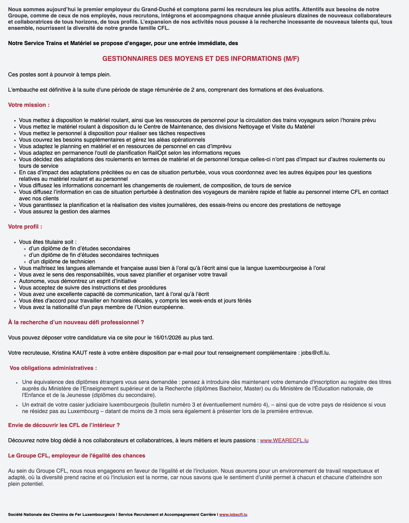 Gestionnaires des moyens et des informations (m/f) / CFL Voir toutes les offres CFL recrute ! Lien pour postuler : cliquez ici
