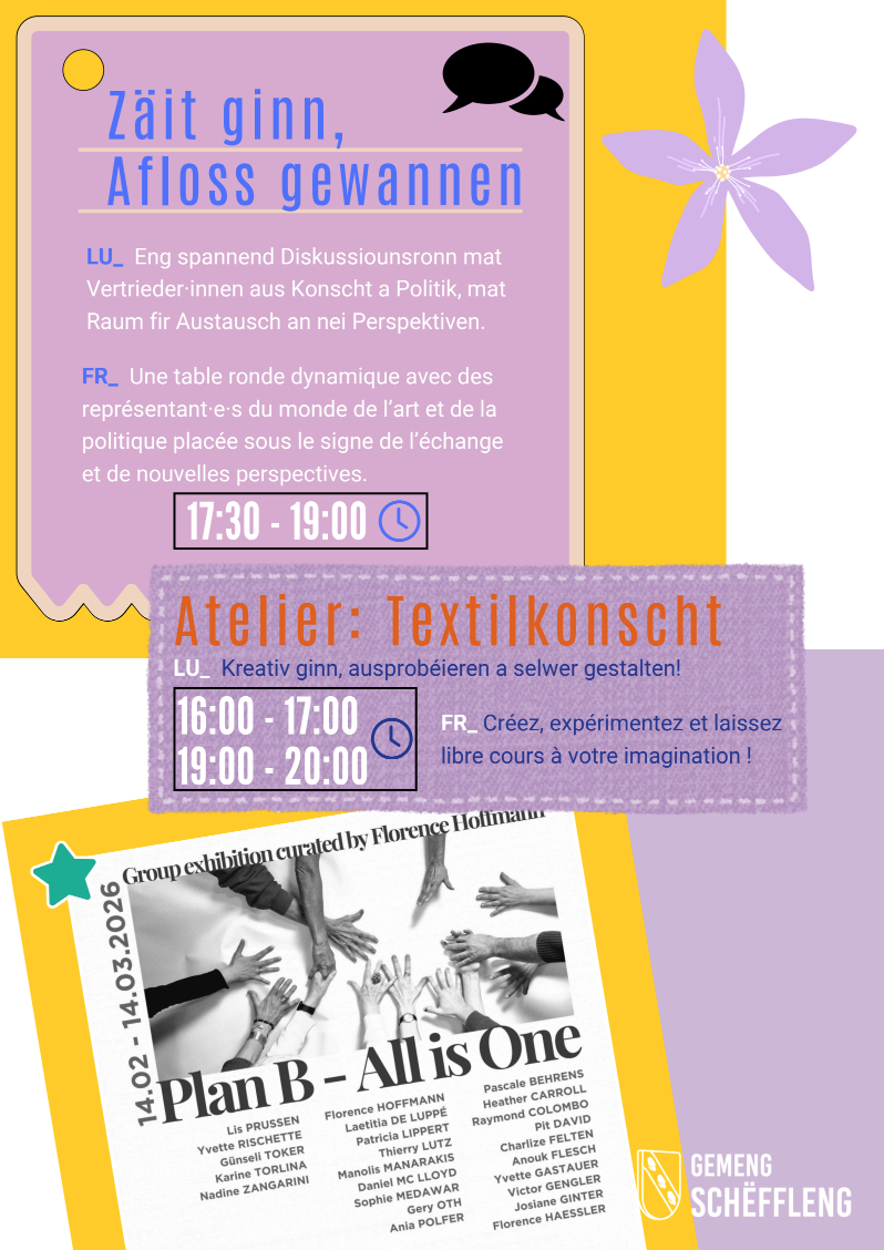 Rendez-vous le 07 mars 2026 de 16h00 à 20h00 à Schëfflenger Konschthaus, 2, Av. de la Libération