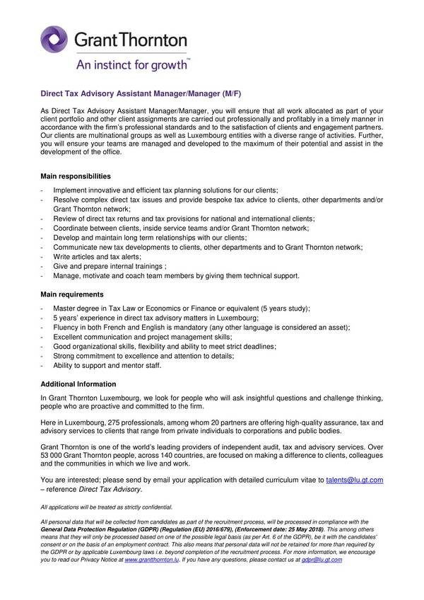 Grant Thornton Luxembourg recrute ! Voir toutes les offres Direct Tax Advisory Assistant Manager/Manager (m/f)