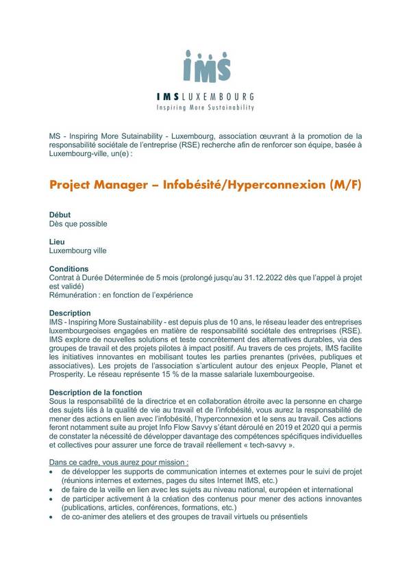 IMS Luxembourg recrute ! Voir toutes les offres Project Manager - Infobésité/Hyperconnexion (h/f) Pour plus d’informations : https://imslux.lu/fra/contact/jobs