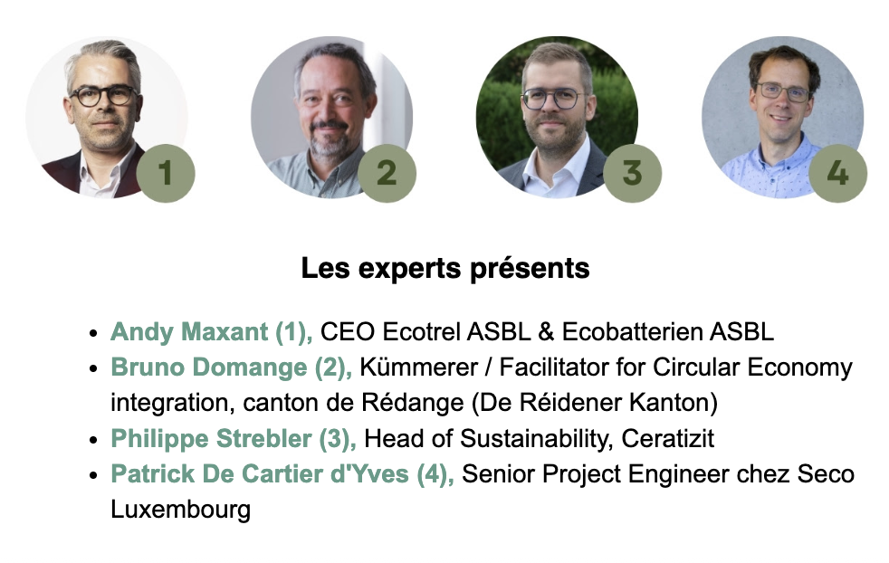 - Une table ronde composée d’experts du secteur de l’industrie au Luxembourg, venus pour partager leurs connaissances et leurs expériences de l’économie circulaire, ses opportunités et ses enjeux ;