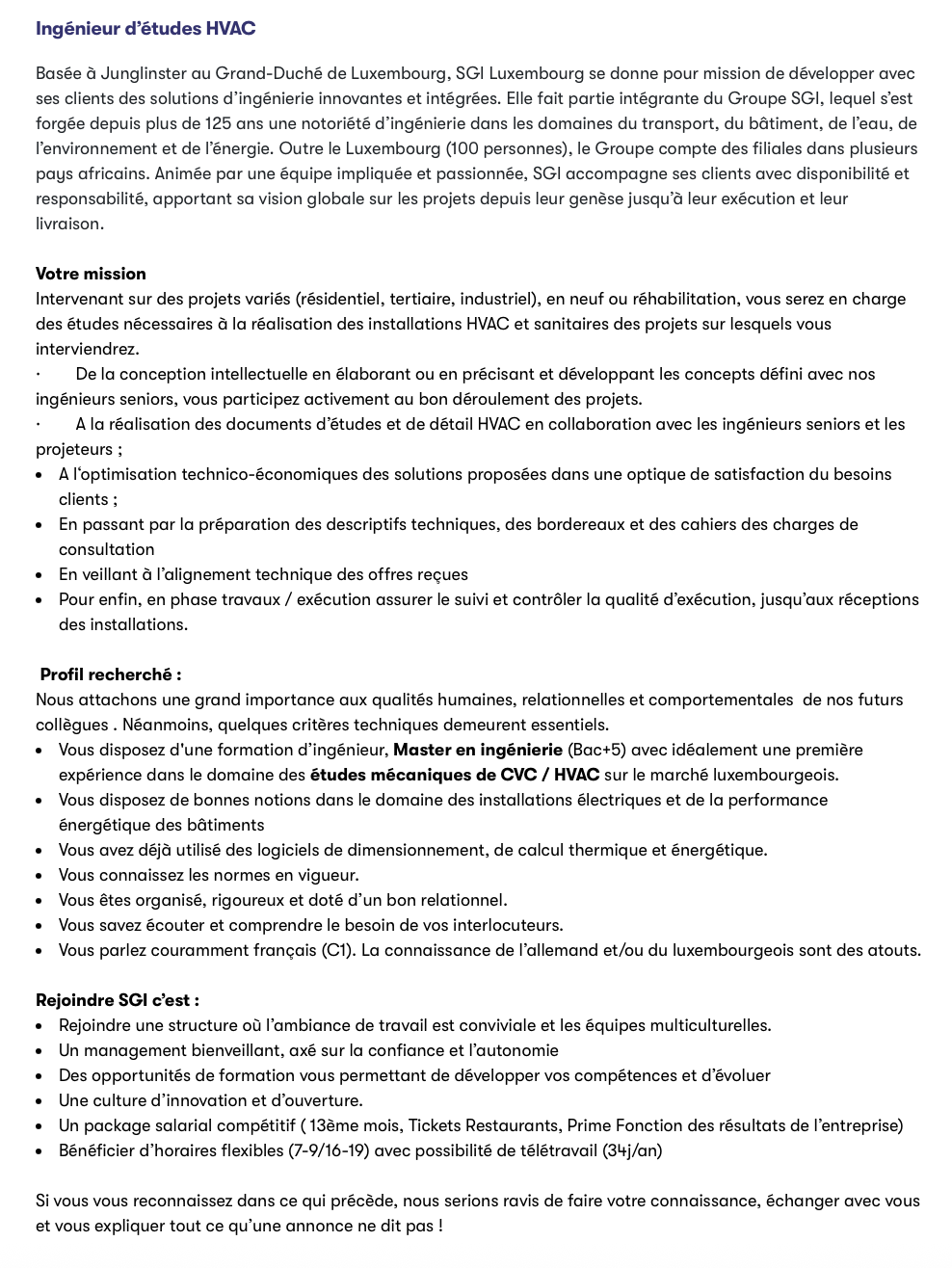 Ingénieur d’études HVAC (M/F) Voir toutes les offres SGI Luxembourg recrute ! Lien pour postuler : cliquez ici