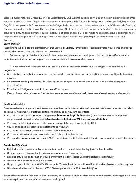 Ingénieur d’études Infrastructures (M/F) Voir toutes les offres SGI Luxembourg recrute ! Lien pour postuler : cliquez ici