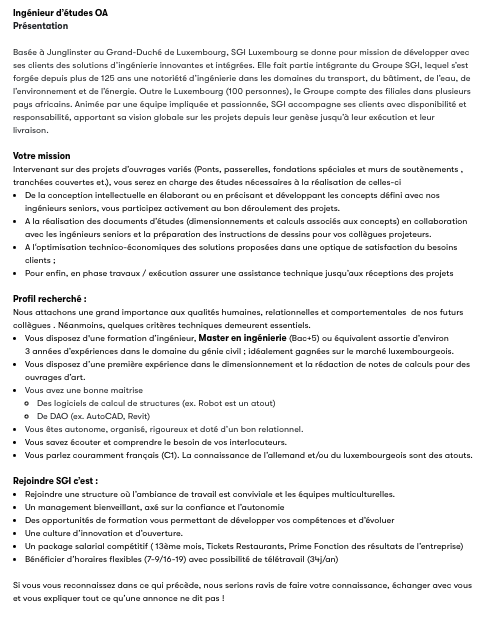 Ingénieur d’études Ouvrages d’art (M/F) Voir toutes les offres SGI Luxembourg recrute ! Lien pour postuler : cliquez ici