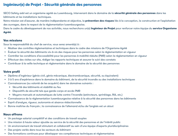 Ingénieur(e) de Projet - Sécurité générale des personnes (M/F) Voir toutes les offres SECO Luxembourg recrute ! Lien pour postuler : cliquez ici