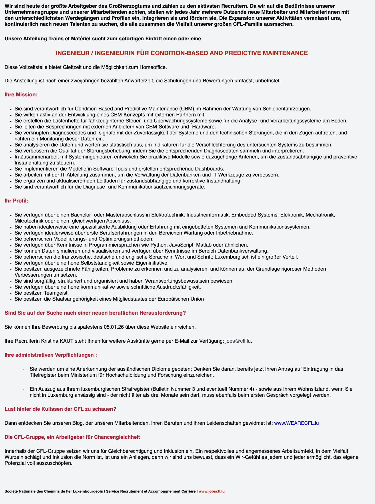 Ingenieur für condition-based and predictive maintenance (m/f) / CFL Voir toutes les offres CFL recrute ! Lien pour postuler : cliquez ici