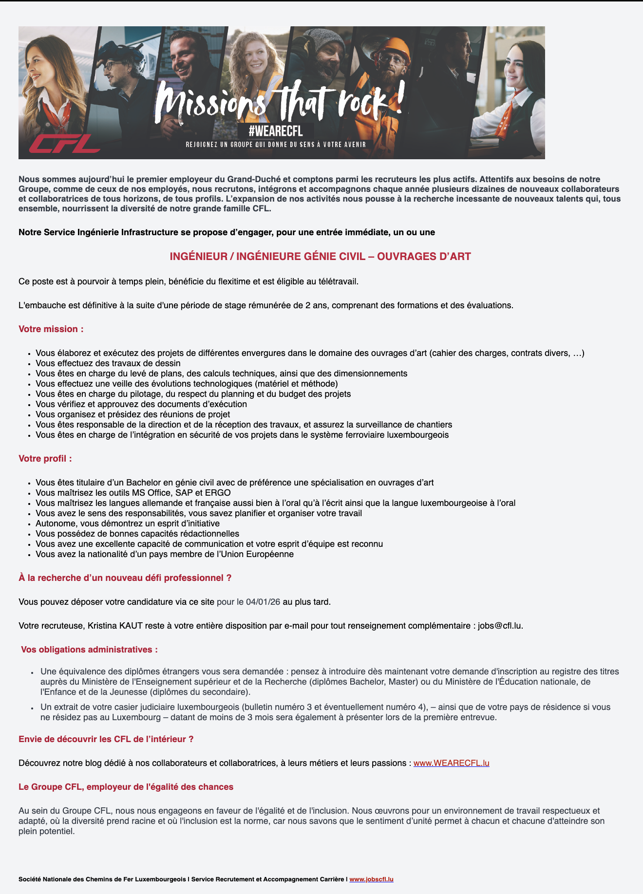 Ingénieur (m/f) Génie civil - Ouvrages d’art / CFL Voir toutes les offres CFL recrute ! Lien pour postuler : cliquez ici