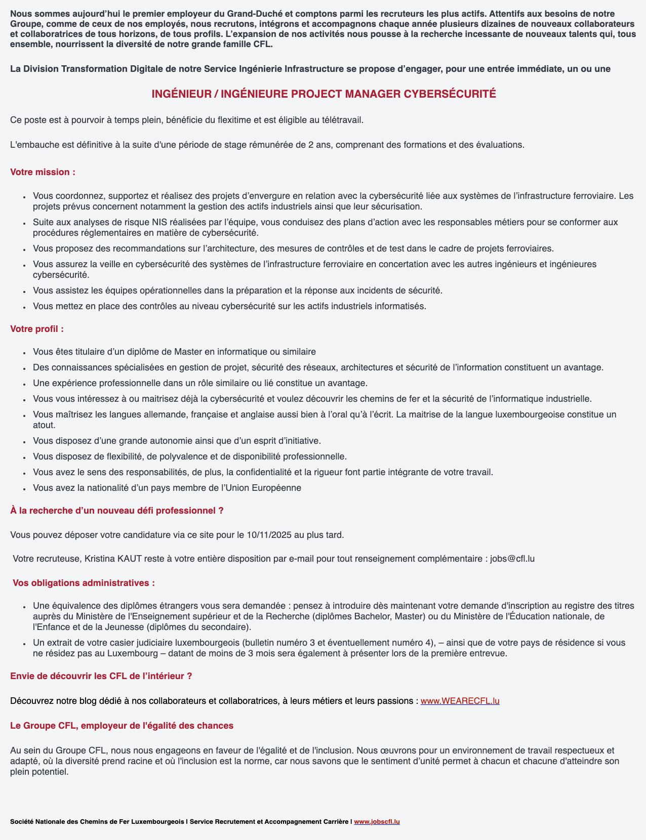 Ingénieur (m/f) Project manager Cybersécurité / CFL Voir toutes les offres CFL recrute ! Lien pour postuler : cliquez ici