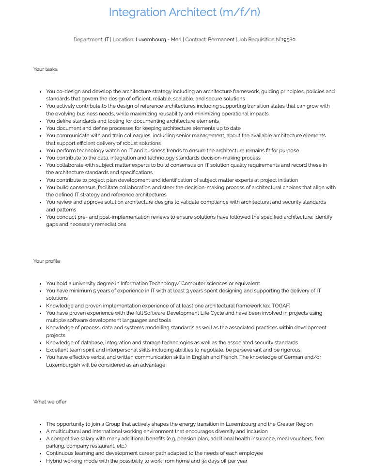 Integration Architect (m/f) / Creos Voir toutes les offres Creos recrute ! Lien pour postuler : cliquez ici