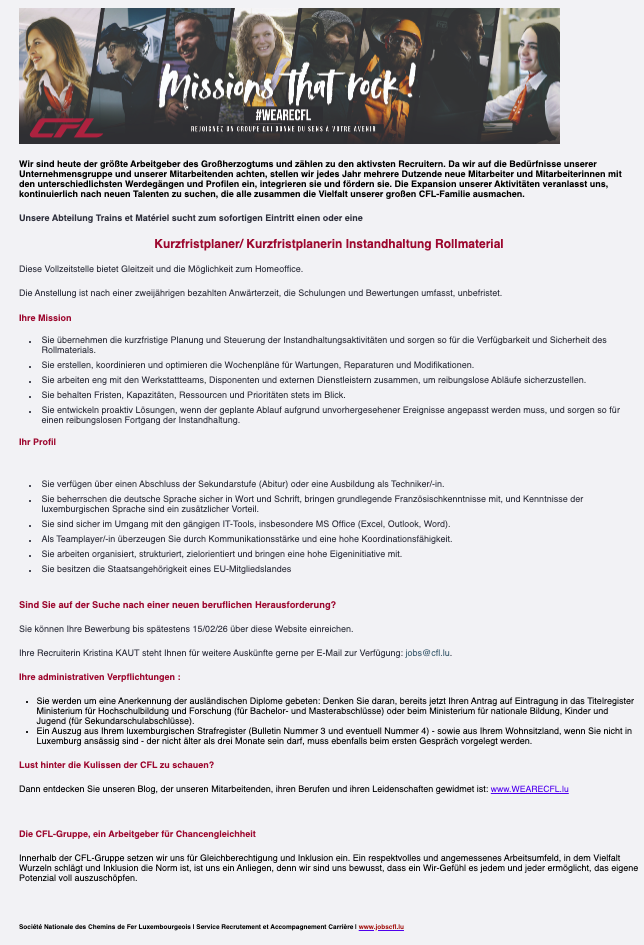 Kurzfristplaner (M/W) Instandhaltung Rollmaterial Voir toutes les offres CFL rekrutieren ! Lien pour postuler : cliquez ici