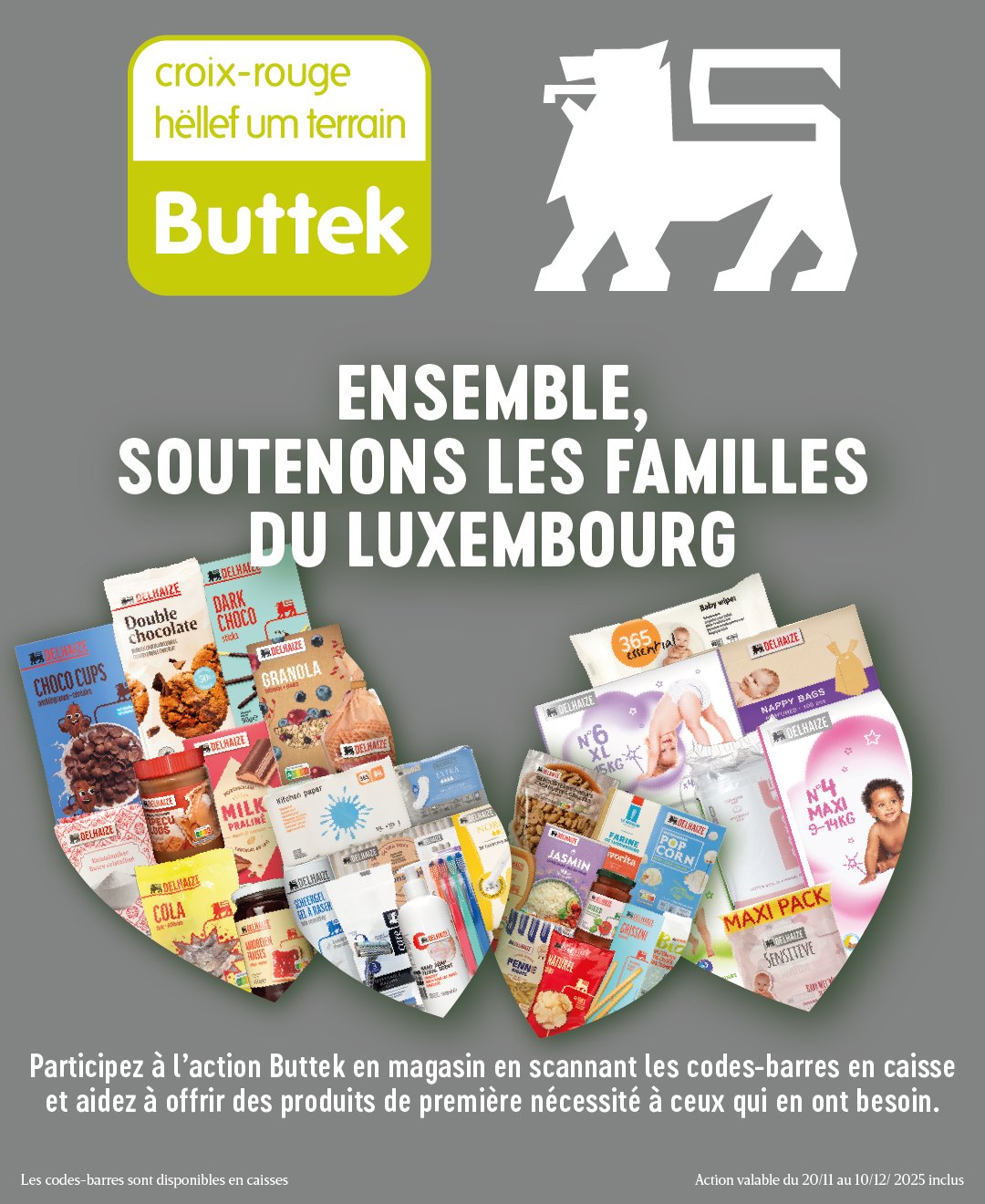 Cette année encore, Delhaize renouvelle sa grande action solidaire Buttek, en partenariat avec la Croix-Rouge luxembourgeoise et Spendchen. Grâce à vous, nous pouvons aider des familles en difficulté à accéder à des produits de première nécessité.