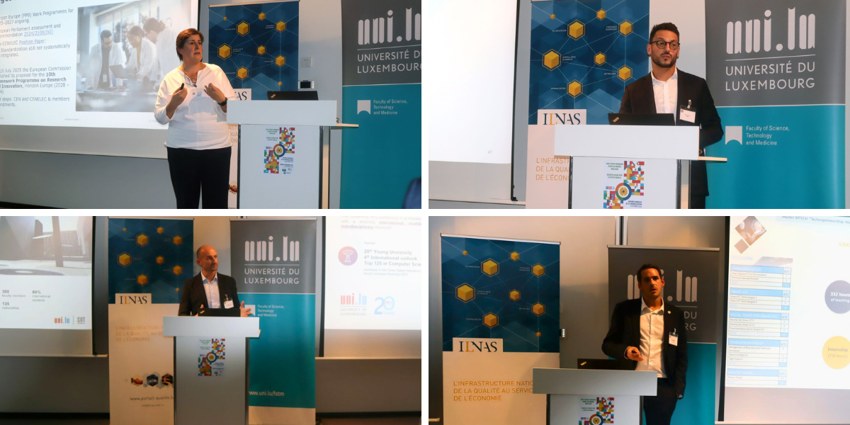 La seconde partie de l’événement était consacrée aux liens entre recherche, innovation, éducation et normalisation. Dans ce contexte, Mme Andreea Gulacsi, Directrice Policy & External Affairs du CEN-CENELEC, a fourni une vue d’ensemble des initiatives menées par les organismes de normalisation européens dans ces domaines et a présenté plusieurs de leurs projets tels que les CEN/CENELEC Standardization + Innovation Awards – dont deux doctorants des programmes de recherche ILNAS–Uni.lu/SnT ont été les lauréats – ou encore le projet européen EDU4Standards. Ces différentes thématiques ont été mises en perspective avec le contexte national via la nouvelle Politique pour l’éducation et la recherche dans le cadre de la normalisation technique (2025-2030) présentée par Dr. Lucas Cicero. Publiée le jour de l’événement, celle-ci fournit une approche harmonisée et un cadre de haut niveau pour les activités nationales en lien avec ces trois domaines, dont le programme de recherche ILNAS–Uni.lu/SnT. Cette fructueuse collaboration entre l’ILNAS et l’Université du Luxembourg a été présentée par Dr. Grégoire Danoy, Research Scientist à l’Université du Luxembourg. Enfin, pour clôturer cette session, M. Nicolas Domenjoud a présenté le Master Technopreneurship (MTECH), initiative de l’ILNAS en matière d’éducation à la normalisation, et a pu revenir sur le succès des deux premières promotions, et sur l’état de celle en cours.