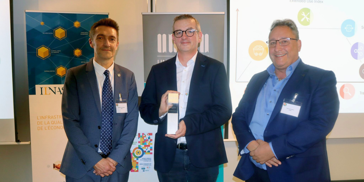 Enfin, l’événement s’est terminé par la cérémonie de remise du prix « ILNAS Standardization and Innovation Award 2025 ». Dr. Jean-Philippe Humbert a eu le plaisir de remettre ce trophée à la société +Impakt (représentée par Dr. Jeannot Schroeder), pour leur projet Circular Tracker qui permet de fournir une évaluation de circularité simplifiée en se basant sur le Product Circularity Data Sheet (ISO 59040:2025), dont le Luxembourg fut à l’origine.