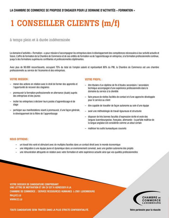 La Chambre de Commerce Luxembourg recrute ! Voir toutes les offres Un conseiller clients (h/f) Plus d’informations sur : https://www.cc.lu