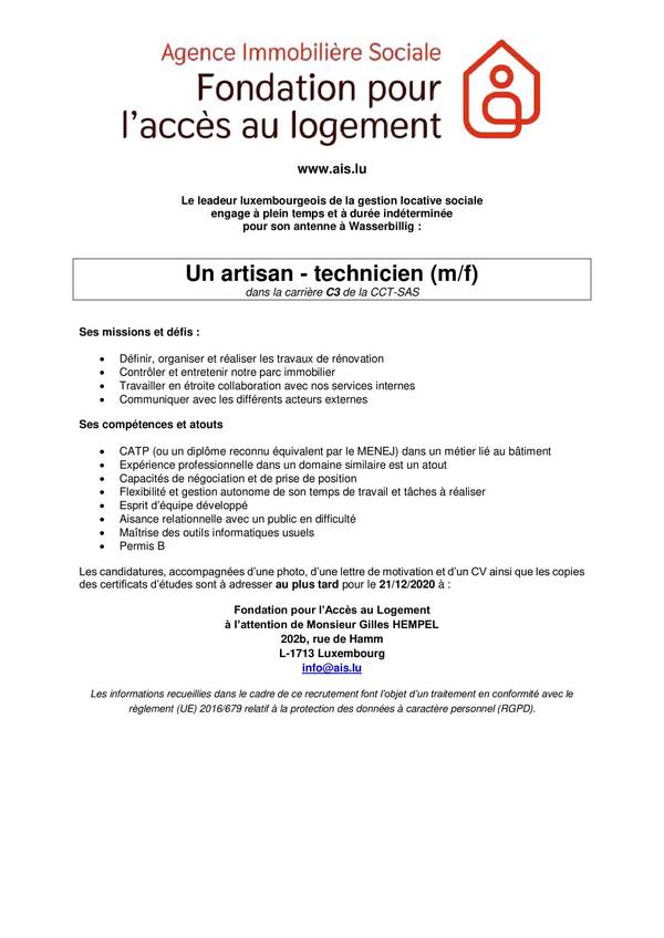 La Fondation pour l’accès au logement recrute ! Voir toutes les offres Artisan - Technicien (m/f) Pour plus d’informations : info@ais.lu