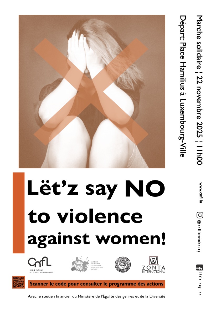 Le samedi 22 novembre, une « marche de solidarité » est organisée par le Conseil national des Femmes du Luxembourg. Le départ de la marche est prévu à 11.00 heures sur la place Hamilius.