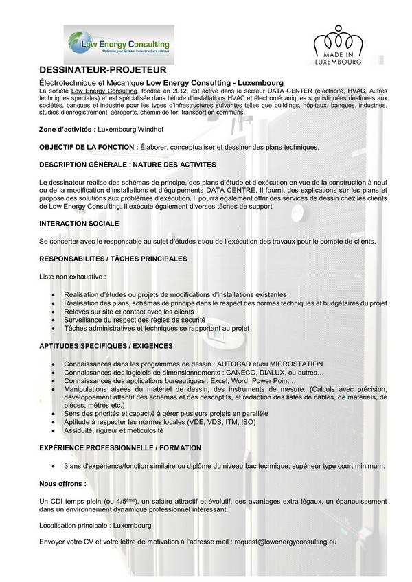 Low Energy Consulting Luxembourg recrute ! Voir toutes les offres Dessinateur / Projeteur Électrotechnique et Mécanique (h/f)