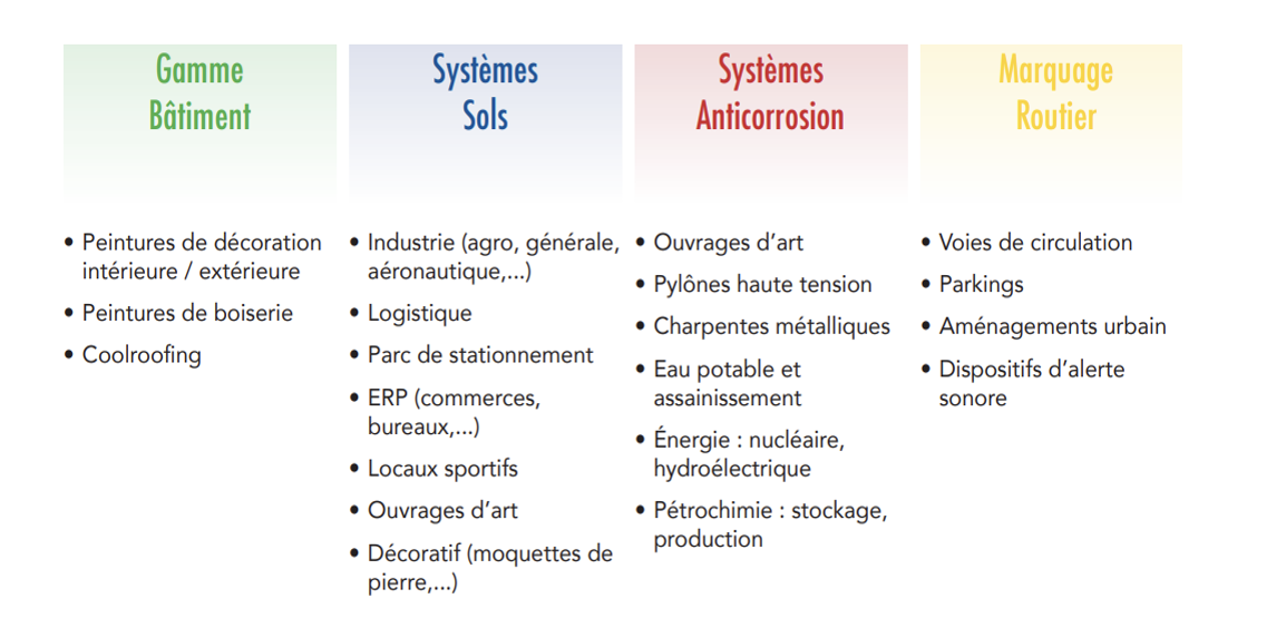Notre gamme de produits couvre un large éventail de besoins : peintures pour le bâtiment, systèmes anticorrosion, résines de sols, marquage routier et solutions grand public. Chaque produit est pensé pour répondre aux exigences les plus strictes en matière de résistance, d’esthétique et de durabilité, garantissant ainsi des résultats optimaux et une protection longue durée des surfaces traitées.