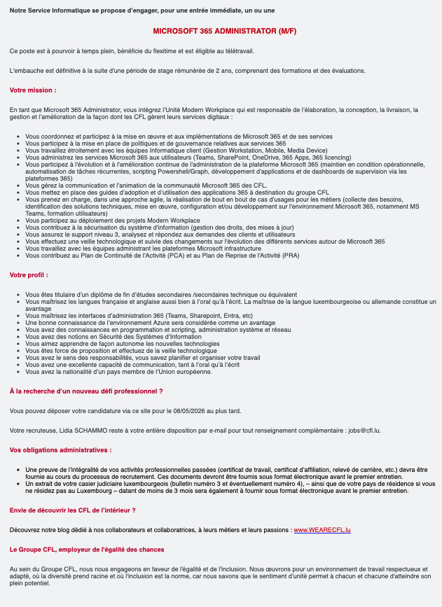 Microsoft 365 Administrator (M/F) Voir toutes les offres CFL recrute ! Lien pour postuler : cliquez ici
