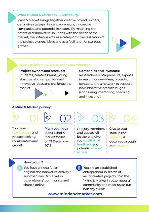 Mind & Market in Luxembourg guides innovative project holders, helps setting up a team and advises on how to test the idea on the market. Join the “Mind and Market in Luxembourg” community now !