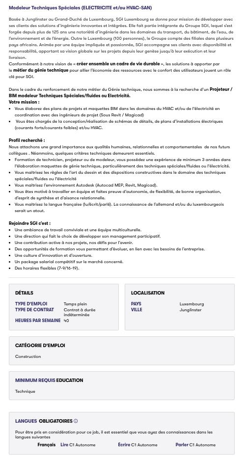 Modeleur Techniques Spéciales (M/F) Voir toutes les offres SGI Luxembourg recrute ! Lien pour postuler : cliquez ici