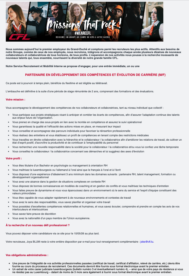 Partenaire en Développement des compétences et Évolution de carrière (M/F) Voir toutes les offres CFL recrute ! Lien pour postuler : cliquez ici