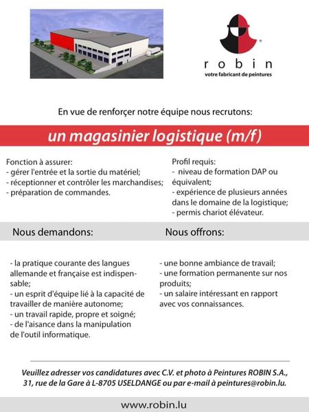 Peintures Robin S.A. recrute ! Voir toutes les offres Magasinier logistique (m/f) Plus d’informations : https://www.facebook.com/3141579220...