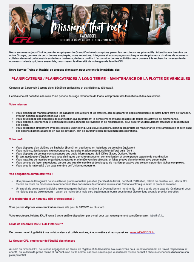 Planificateur à long terme - maintenance de la flotte de véhicules Voir toutes les offres CFL recrute ! Lien pour postuler : cliquez ici