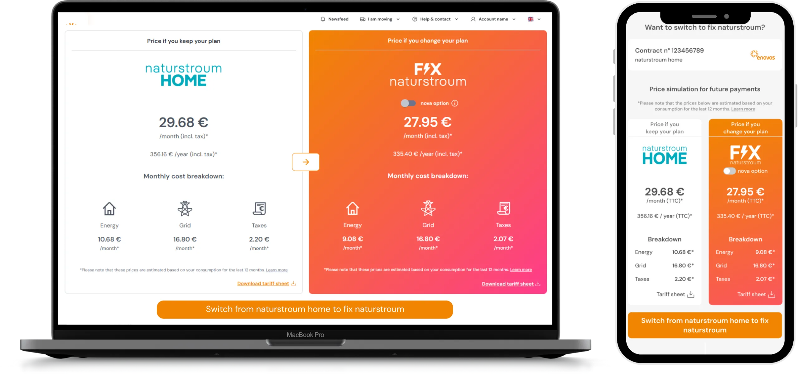 C’est ici que le Product Discovery révèle tout son potentiel ! Oubliez les estimations génériques. En s’appuyant sur vos données historiques de consommation issues de votre compte MyEnovos, l’outil génère une simulation personnalisée. Vous verrez précisément combien vous pourriez économiser, chaque mois et chaque année, en passant à un autre tarif Enovos éligible.