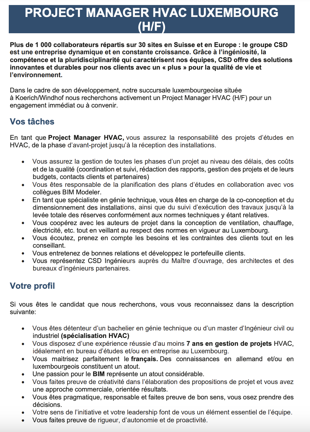 Project Manager HVAC (M/F) / CSD Voir toutes les offres CSD recrute ! Lien pour postuler : cliquez ici