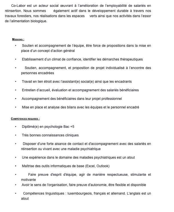 Psychologue (m/f) / Co-Labor Voir toutes les offres Co-Labor recrute ! Lien pour postuler : cliquez ici