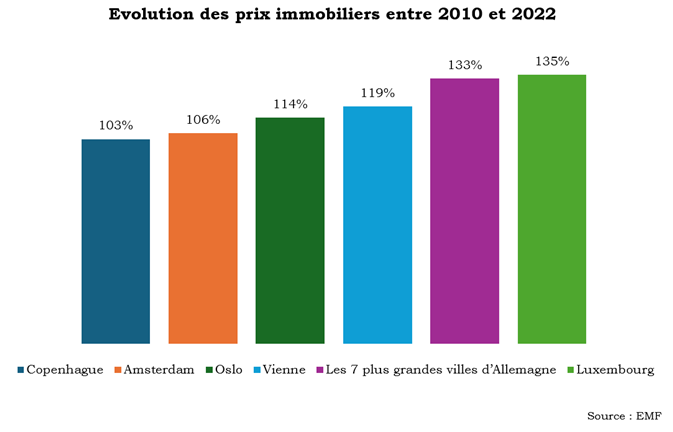 Aussi, il n’est pas assez considéré que l’importante flambée des prix immobiliers observée dans le pays entre 2010 et 2022 est comparable à ce qui a été observé dans de nombreuses métropoles européennes, notamment Vienne et Amsterdam souvent citées au Luxembourg comme modèles car elles regorgent de logements sociaux.