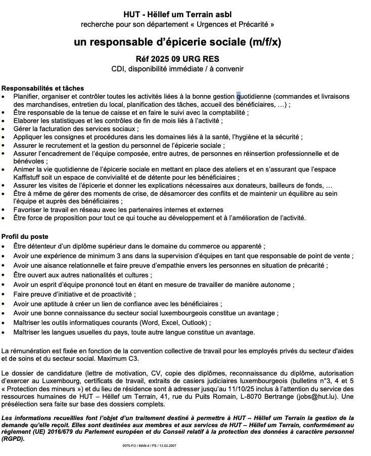 Responsable d’épicerie sociale (m/f) / HUT Voir toutes les offres HUT recrute ! Lien pour postuler : cliquez ici