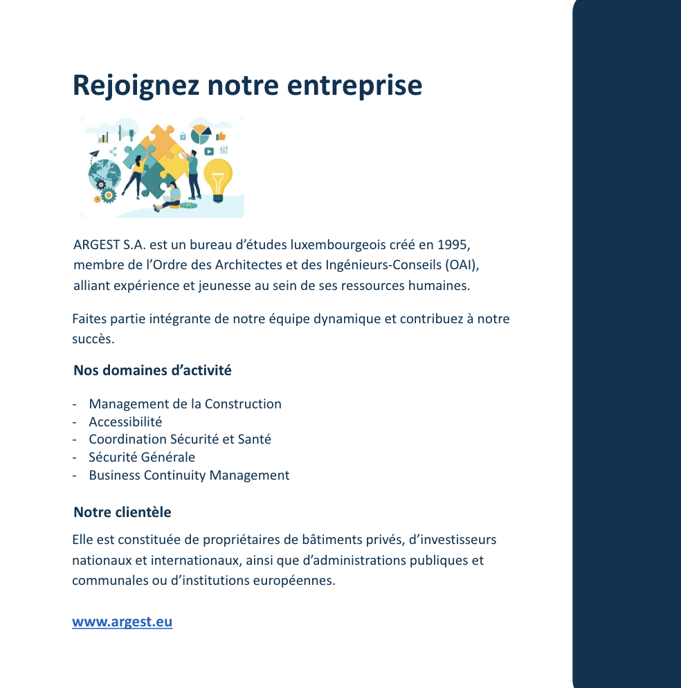 Responsable de projet Informatique (m/f) / ARGEST Voir toutes les offres ARGEST S.A. recrute ! Postulez dès maintenant ! Transmettez votre candidature à mail@argest.eu Lien pour postuler : cliquez ici