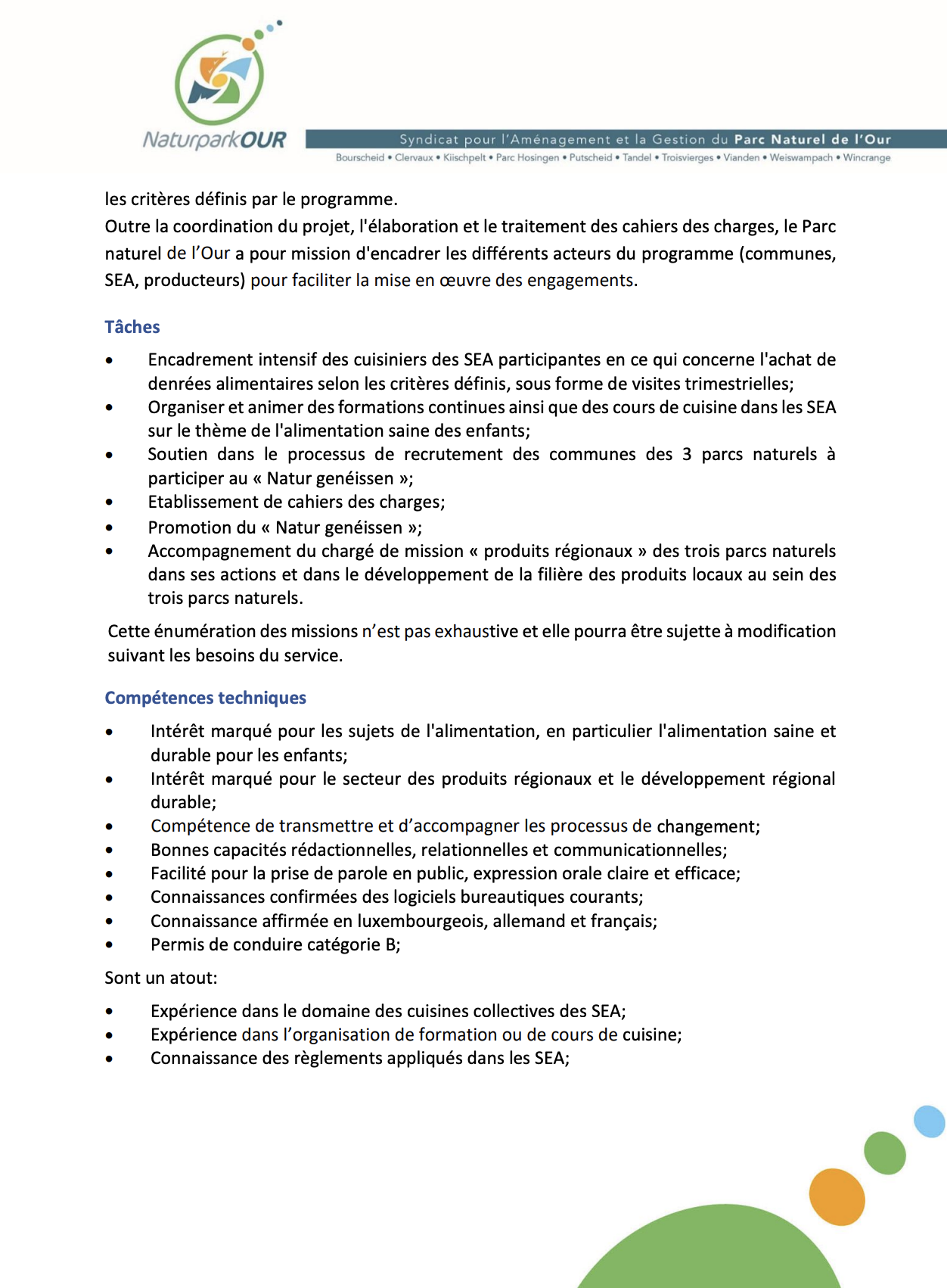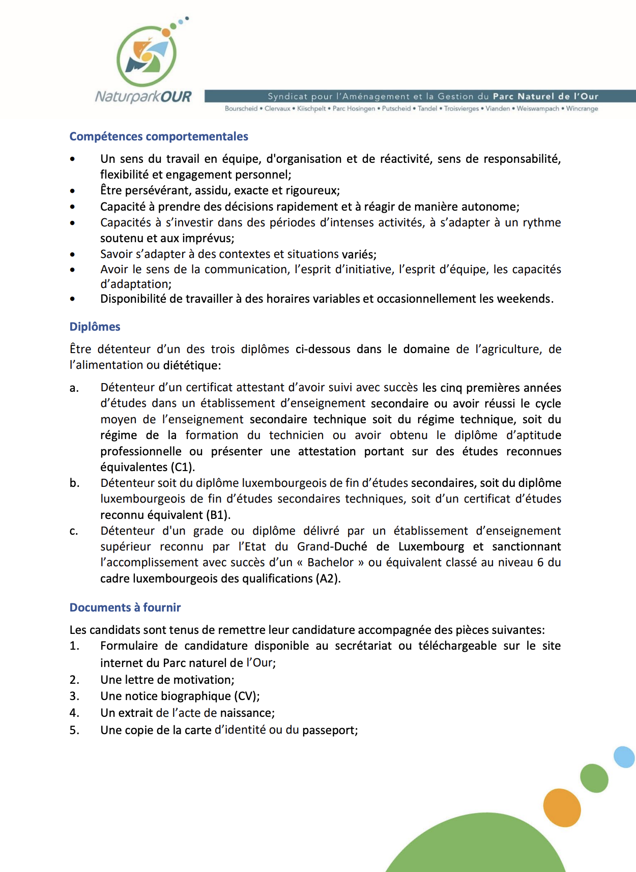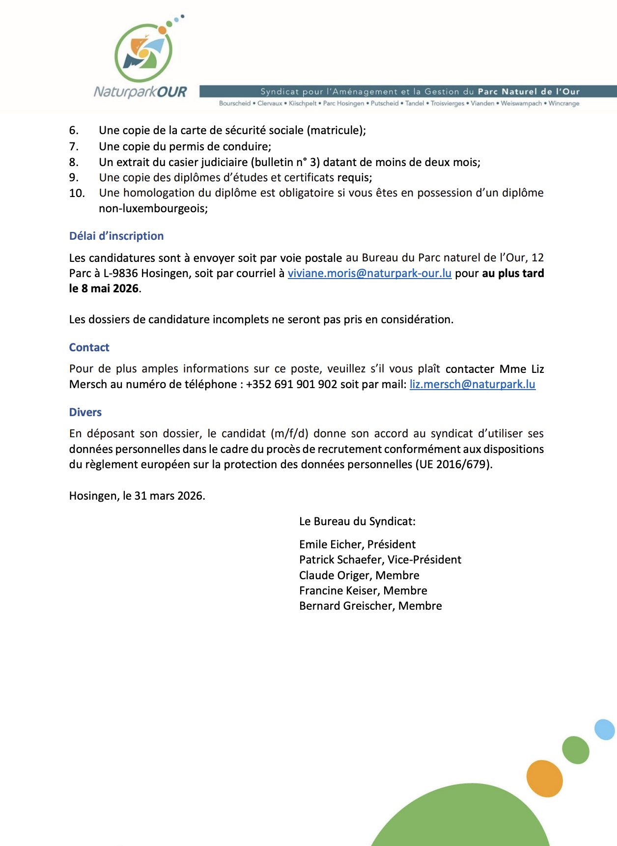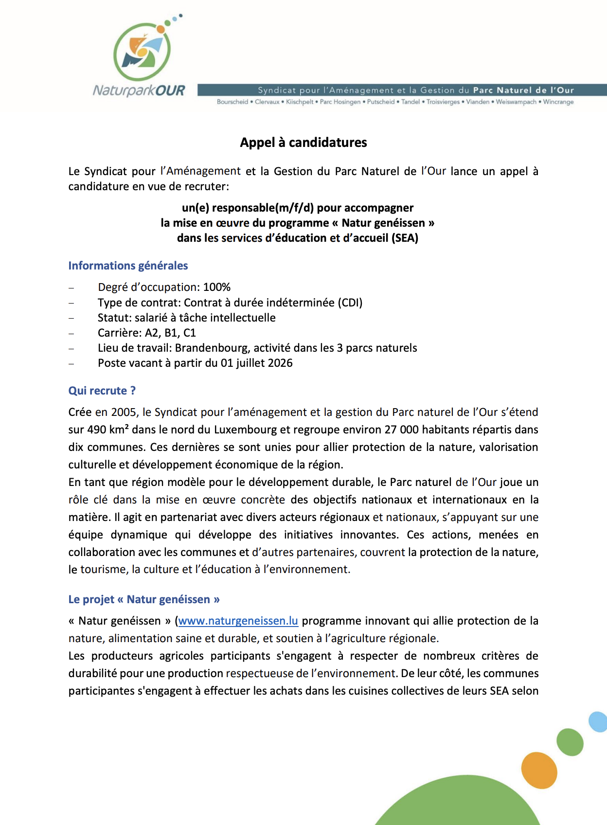 Responsable (M/W/D) Natur genéissen Voir toutes les offres Le Parc naturel de l’Our recrute ! Lien pour postuler : cliquez ici