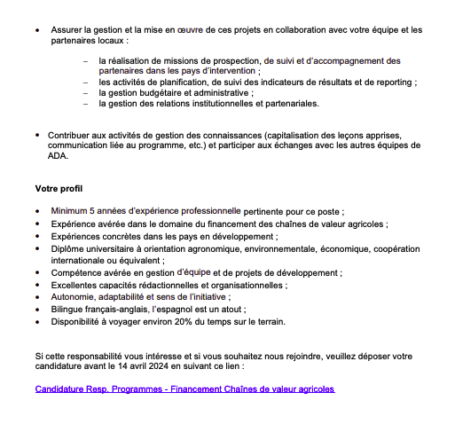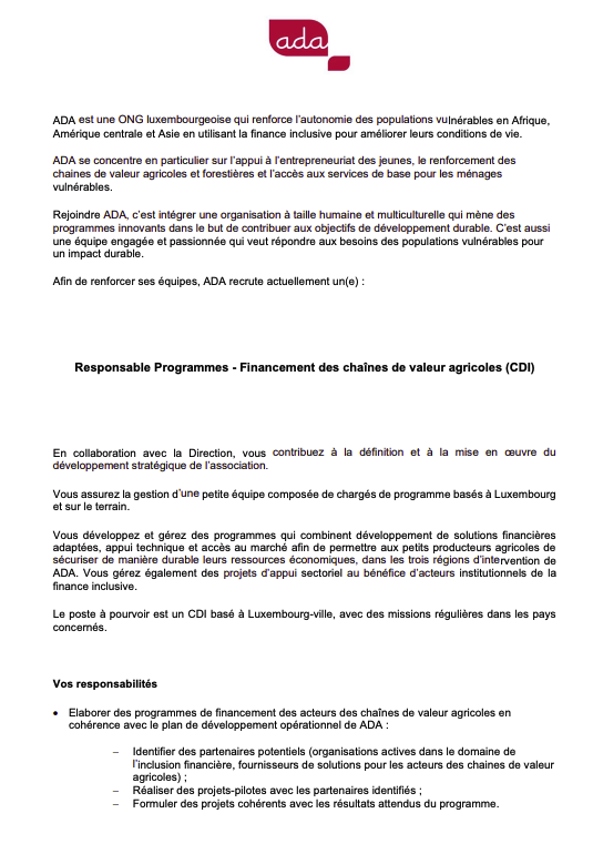 Responsable Programmes - Financement des chaînes de valeur agricoles (CDI)/ ADA Voir toutes les offres ADA - Appui au Développement Autonome recrute ! Pour plus d’informations : www.ada-microfinance.lu Lien pour postuler : cliquez ici