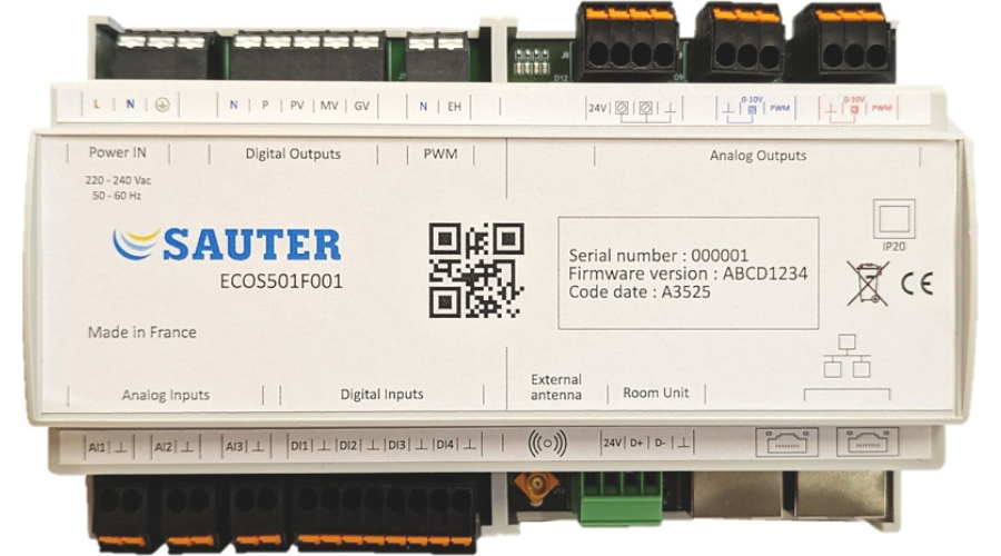 L’ECOS 501 est un régulateur communicant conçu pour s’adapter à toutes les configurations de ventilo-convecteurs (2 tubes, 2 tubes avec résistance, 4 tubes). Il intègre un serveur web embarqué pour le paramétrage et peut être associé à des capteurs intelligents mesurant notamment la température, l’humidité, le CO₂, les composés organiques volatils (COV), la luminosité et le bruit. Grâce à sa communication, il s’intègre facilement dans les environnements IoT et reste compatible avec les solutions SAUTER existantes, offrant ainsi une solution ouverte, évolutive et simple à déployer.
