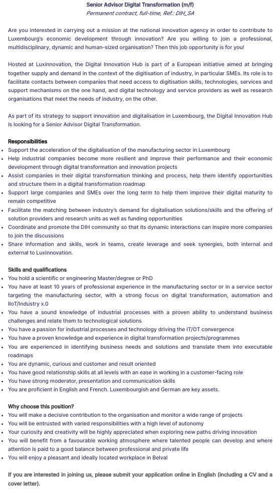 Senior Advisor Digital Transformation (m/f) / Luxinnovation Voir toutes les offres Luxinnovation recrute ! Lien pour postuler : cliquez ici