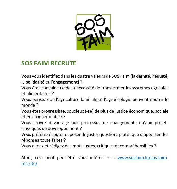 SOS Faim Luxembourg recrute ! Voir toutes les offres Responsable de partenariat (h/f) Pour plus d’informations : http://www.sosfaim.lu/sos-faim-recrute/