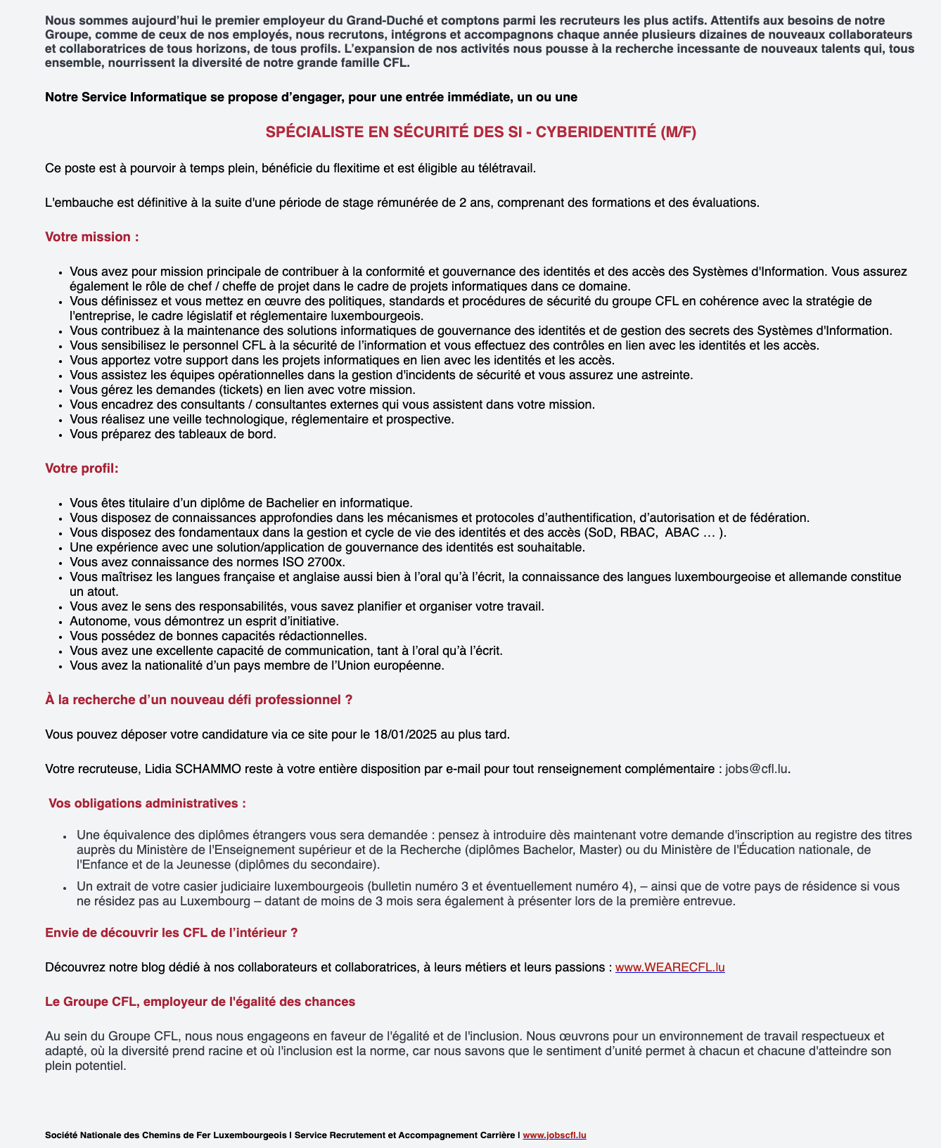 Spécialiste en sécurité des SI - Cyberidentité (m/f) / CFL Voir toutes les offres CFL recrute ! Lien pour postuler : cliquez ici