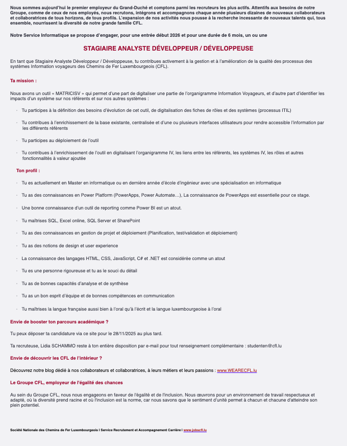Stagiaire Analyste Développeur (m/f) / CFL Voir toutes les offres CFL recrute ! Lien pour postuler : cliquez ici