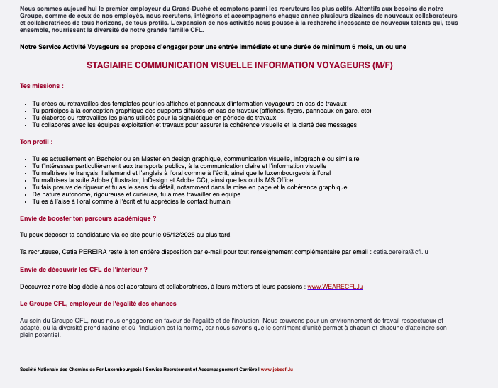Stagiaire Communication Visuelle Information Voyageurs (m/f) / CFL Voir toutes les offres CFL recrute ! Lien pour postuler : cliquez ici