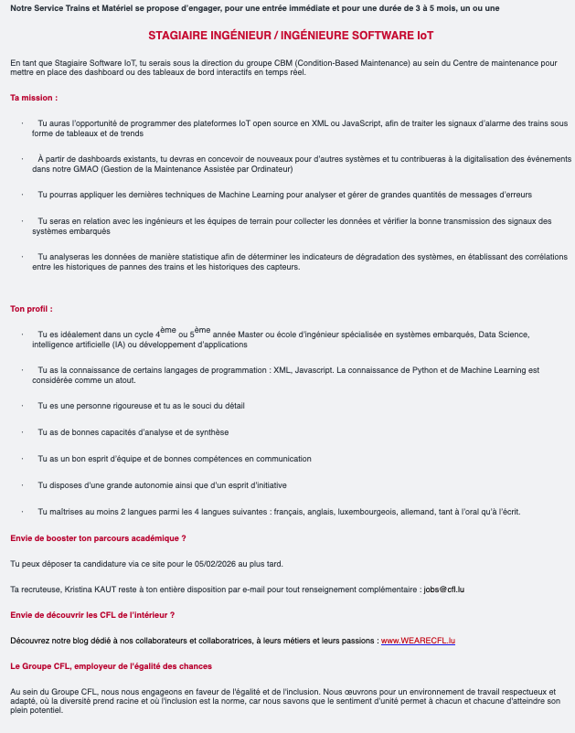Stagiaire Ingénieur software IoT (M/F) Voir toutes les offres CFL recrute ! Lien pour postuler : cliquez ici