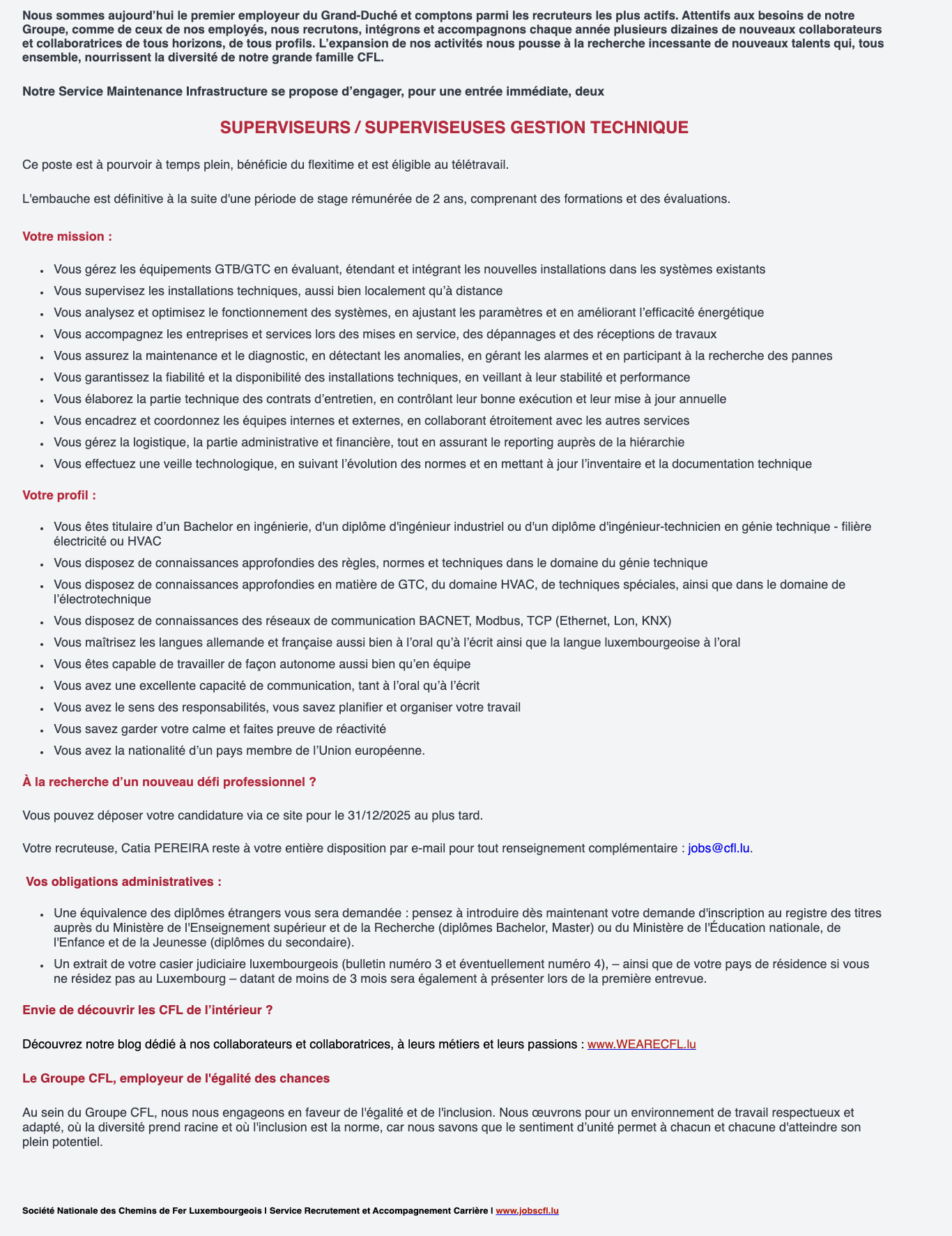 Superviseurs gestion technique (m/f) / CFL Voir toutes les offres CFL recrute ! Lien pour postuler : cliquez ici