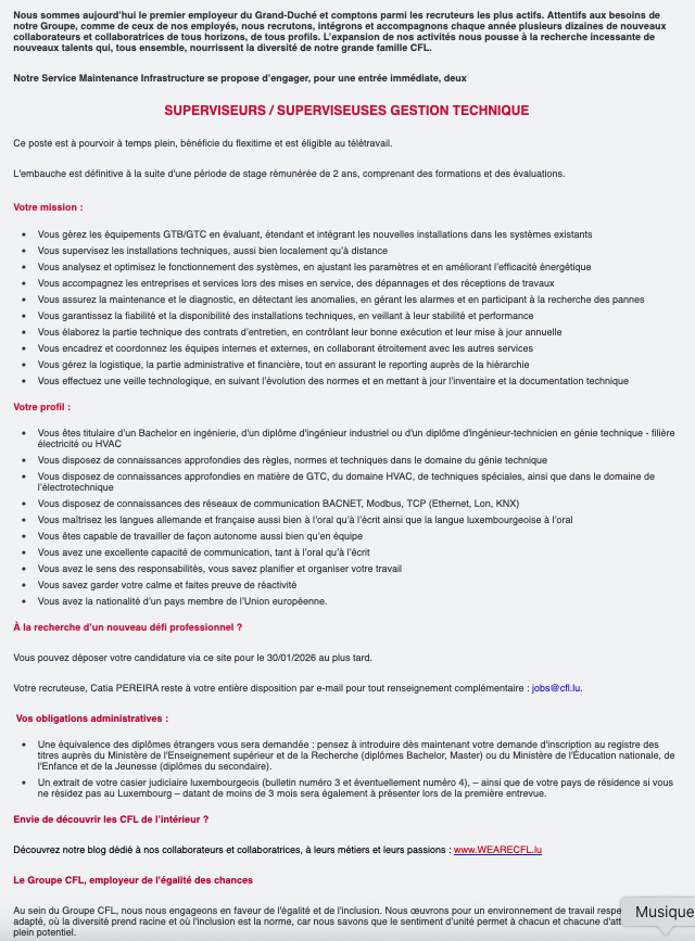 Superviseurs gestion technique (m/f) / CFL Voir toutes les offres CFL recrute ! Lien pour postuler : cliquez ici