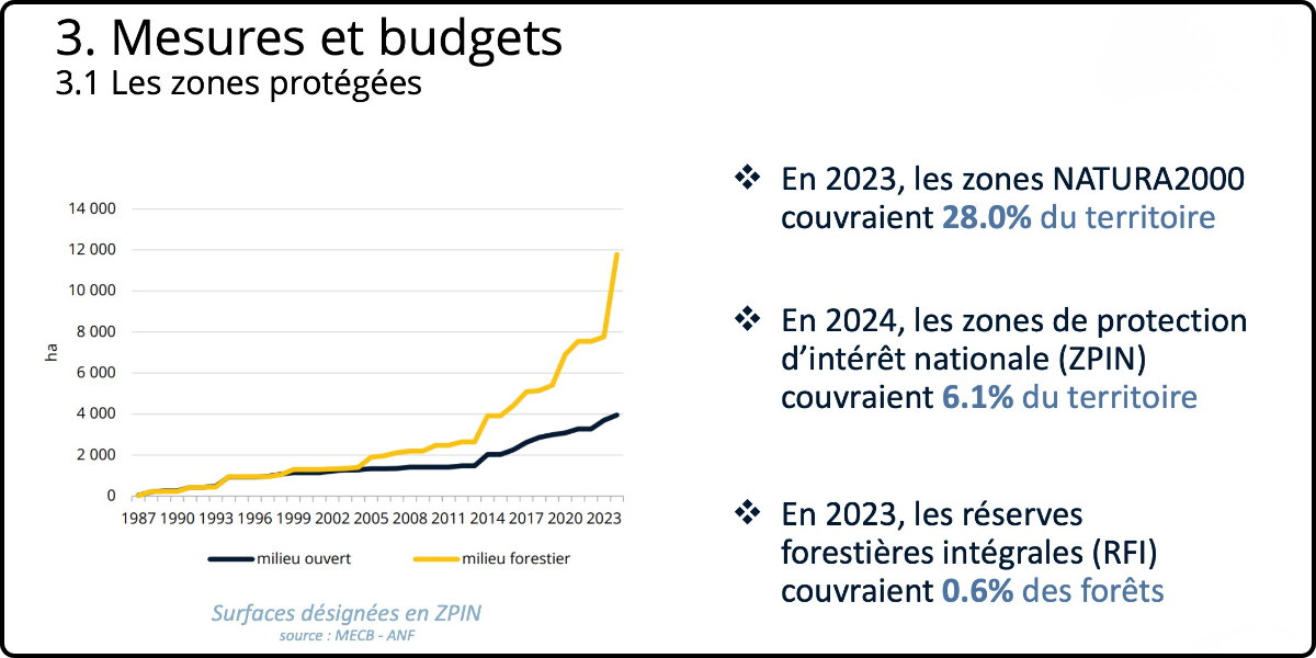 Les zones naturelles protégées couvrent 28 % du territoire, avec un objectif de 30 % d’ici 2030. Les instruments financiers ont progressé, représentant environ 90 millions d’euros en 2022 et plus de 800 emplois.